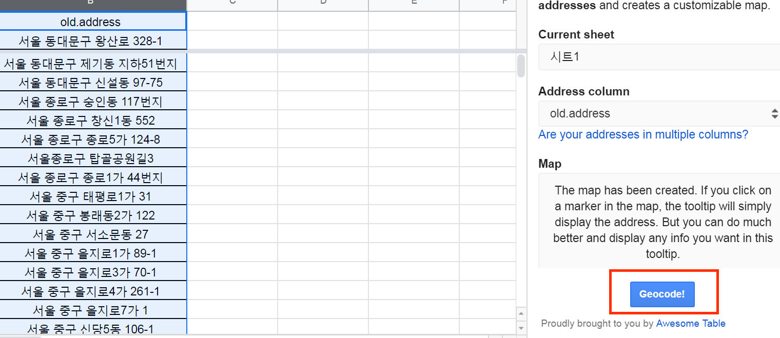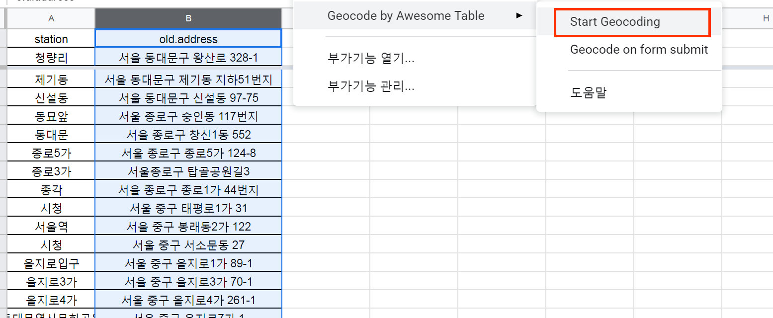 서울시 지하철역의 주소를 경도와 위도로 변환해 보자. 주사가 들어가 있는 열을 선택 후 부가기능 - Geocode by Awesome Table - Start Geocoding을 선택한다