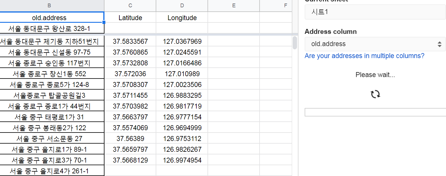 Geocode!를 누르면 자동으로 변환된 위도와 경도 정보가 셀에 입력된다. 작업이 완료되면 해당 정보를 활용할 수 있다.