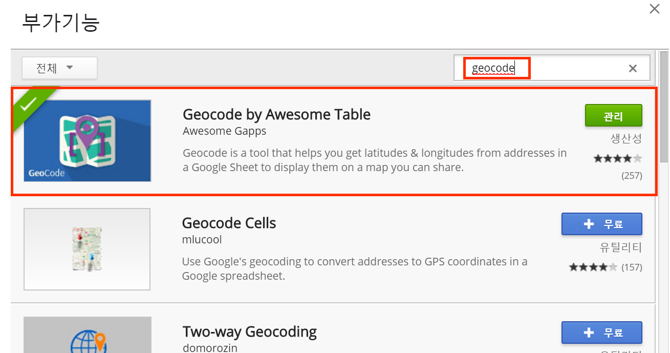 부가기능 검색창에서 geocode를 입력 후 Geocode by Awesome Table을 선택한다