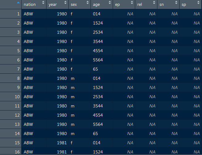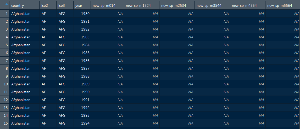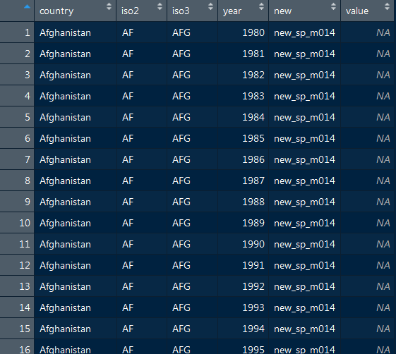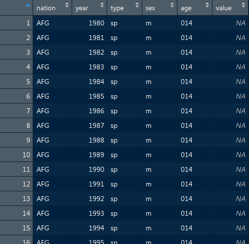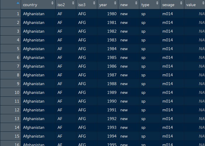 > table1 # A tibble: 6 x 4 country year cases population <fct> <int> <int> <int> 1 Afghanistan 1999 745 19987071 2 Afghanistan 2000 2666 20595360 3 Brazil 1999 37737 172006362 4 Brazil 2000 80488 174504898 5 China 1999 212258 1272915272 6 China 2000 213766 1280428583