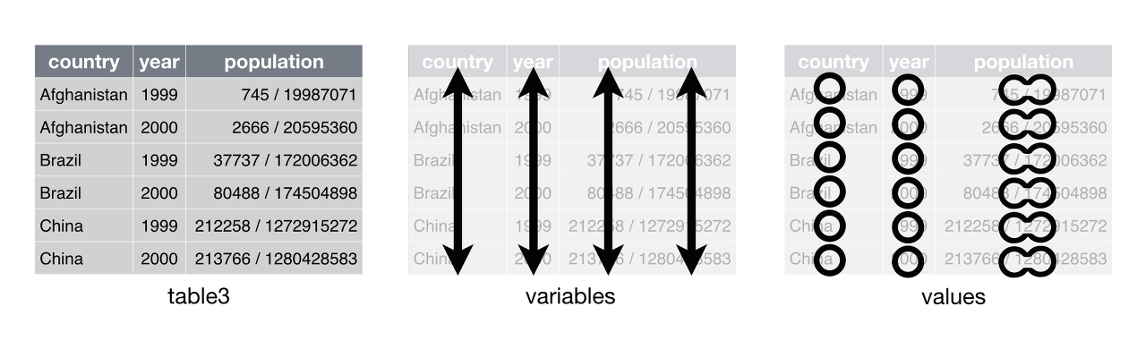 > table3 # A tibble: 6 x 3 country year rate <fct> <int> <chr> 1 Afghanistan 1999 745/19987071 2 Afghanistan 2000 2666/20595360 3 Brazil 1999 37737/172006362 4 Brazil 2000 80488/174504898 5 China 1999 212258/1272915272 6 China 2000 213766/1280428583