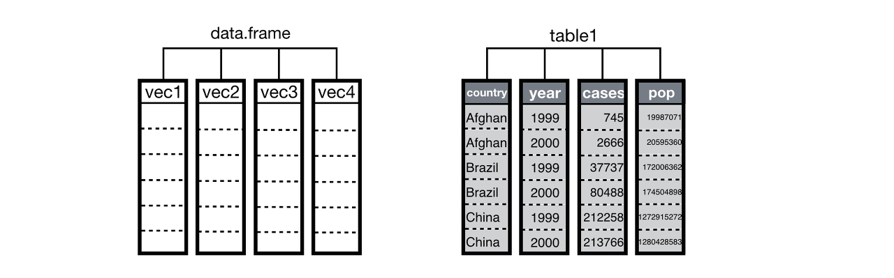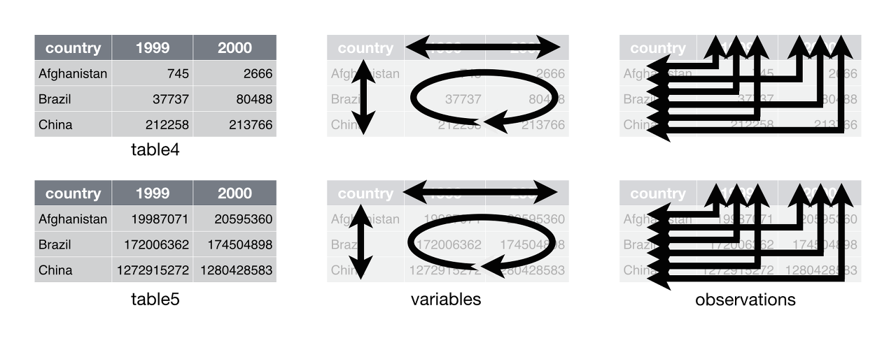 > table4; table5 # A tibble: 3 x 3 country `1999` `2000` <fct> <int> <int> 1 Afghanistan 745 2666 2 Brazil 37737 80488 3 China 212258 213766 # A tibble: 3 x 3 country `1999` `2000` <fct> <int> <int> 1 Afghanistan 19987071 20595360 2 Brazil 172006362 174504898 3 China 1272915272 1280428583