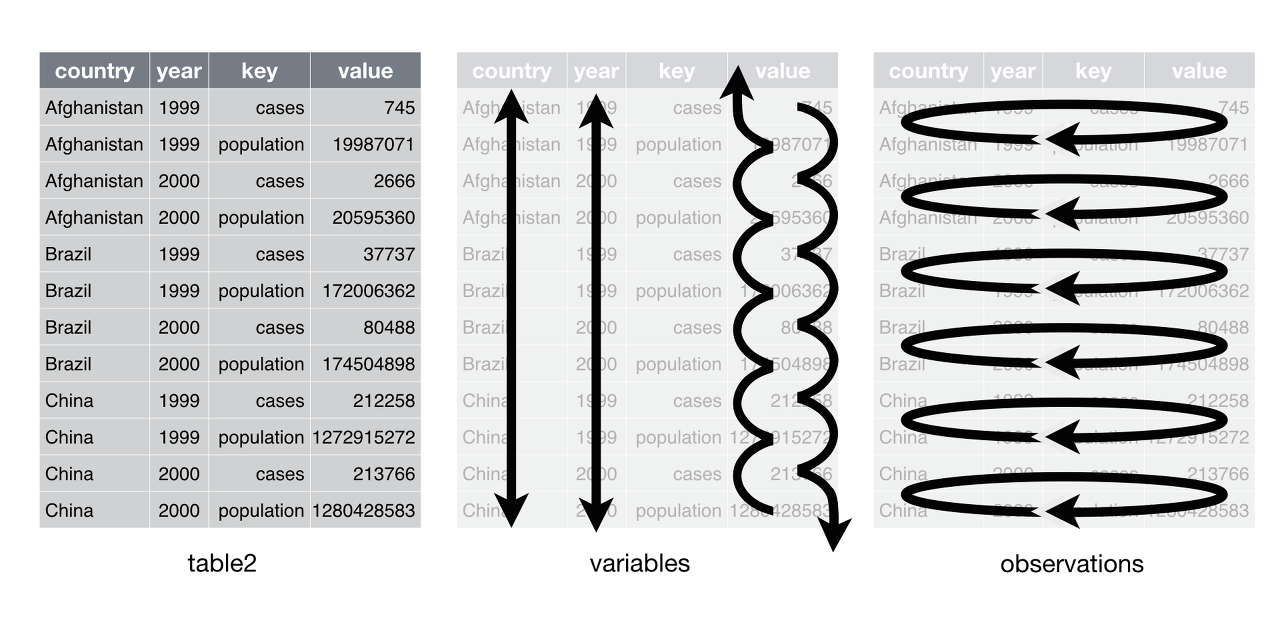 > table2 # A tibble: 12 x 4 country year key value <fct> <int> <fct> <int> 1 Afghanistan 1999 cases 745 2 Afghanistan 1999 population 19987071 3 Afghanistan 2000 cases 2666 4 Afghanistan 2000 population 20595360 5 Brazil 1999 cases 37737 6 Brazil 1999 population 172006362 7 Brazil 2000 cases 80488 8 Brazil 2000 population 174504898 9 China 1999 cases 212258 10 China 1999 population 1272915272 11 China 2000 cases 213766 12 China 2000 population 1280428583