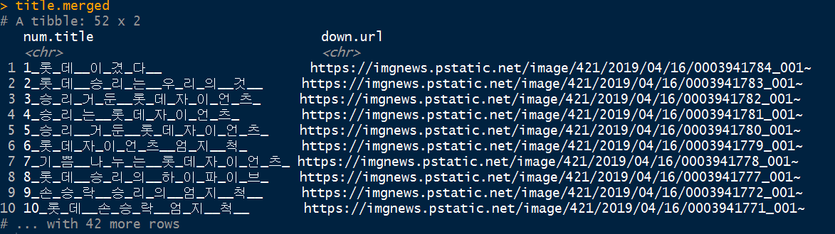 title.merged <- matrix(nrow = 60, ncol = 3) %>% as.tibble %>% rename(num = V1, title = V2, down.url = V3)
