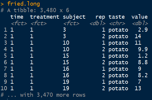 fried.long <- fried %>% gather("taste","value", 5:9)