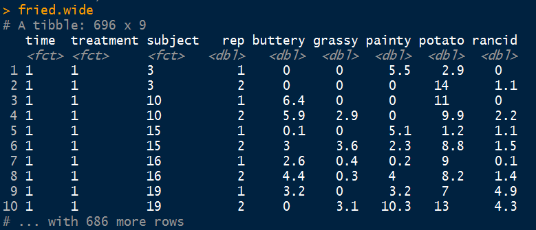 fried.wide <- fried.long %>% spread(taste, value, 5:6)