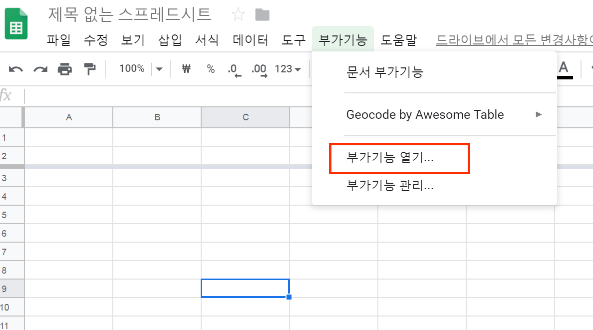 부가기능 검색창에서 geocode를 입력 후 Geocode by Awesome Table을 선택한다
