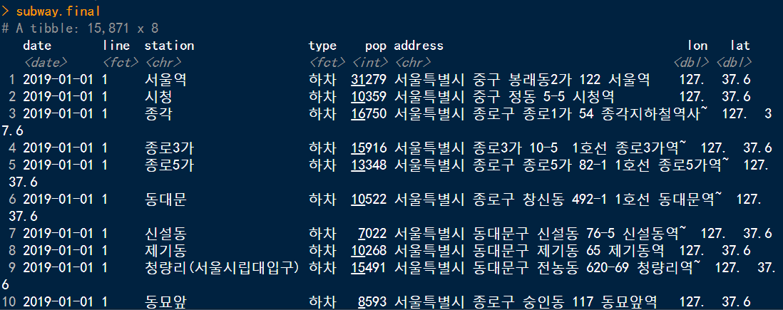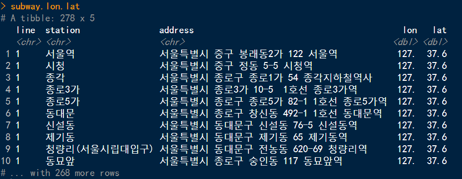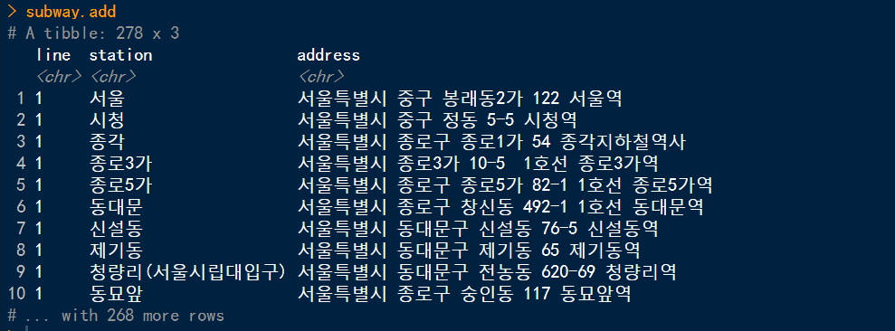 rename(line = 호선, station = 역명, address = 상세주소) %>%