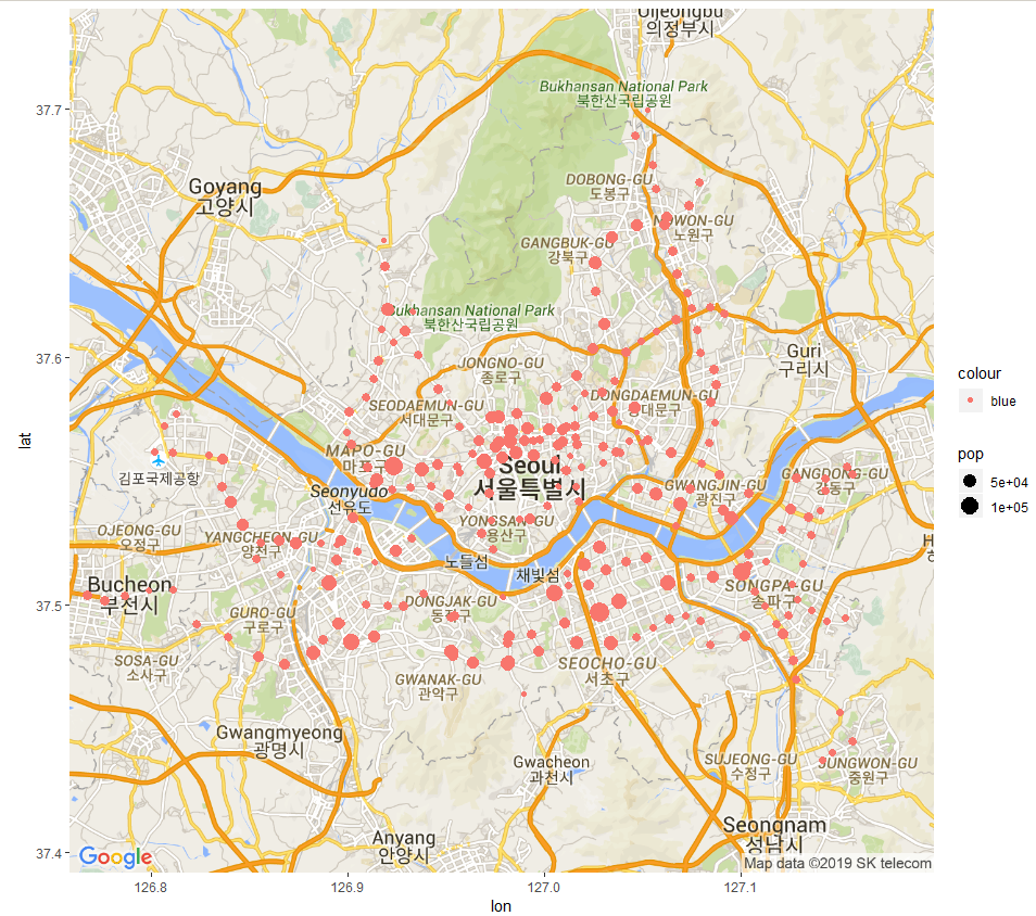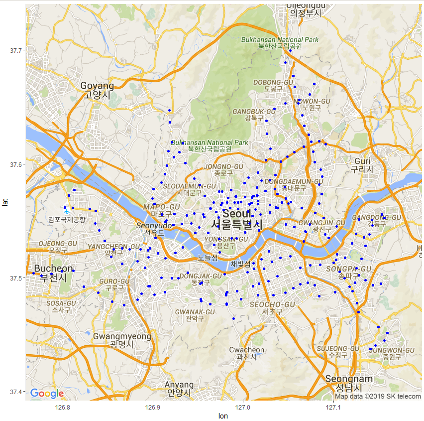 ggmap(map.seoul) + geom_point(data = subway.final,