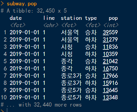 이 데이터를 R로 불러온 후 날짜, 호선, 역명, 구분, 합계 데이터로 새로운 Tibble을 생성한다